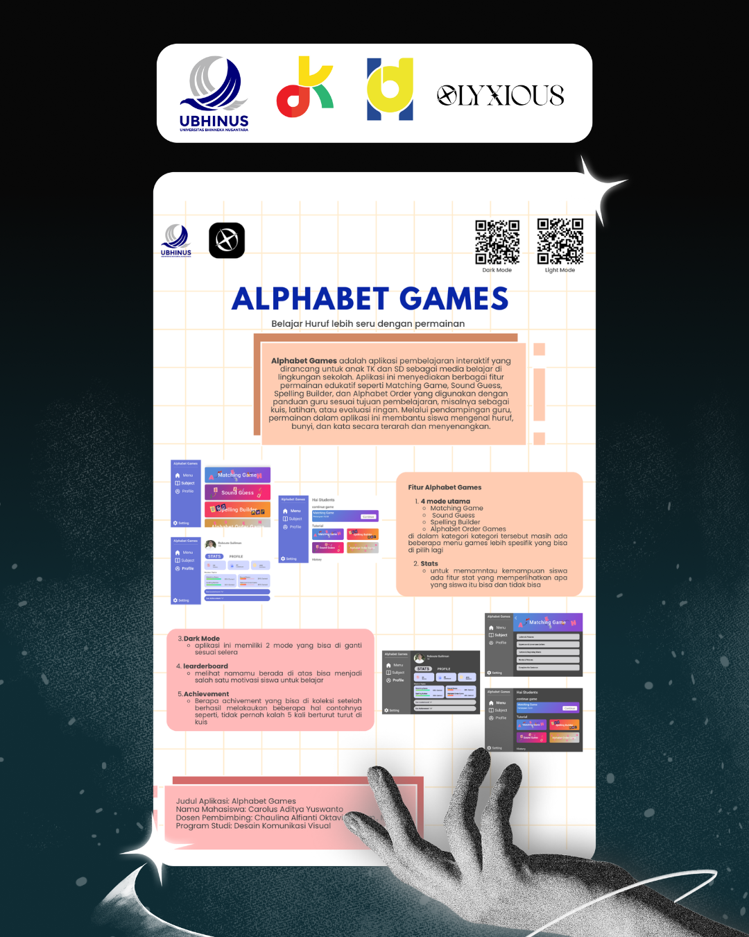 Alphabet Games is an interactive learning application designed for kindergarten and elementary school students as a supportive learning medium in the school environment. The application offers a variety of educational game features, such as Matching Game, Sound Guess, Spelling Builder, and Alphabet Order, which are used under teacher guidance according to learning objectives, for example as quizzes, practice activities, or light evaluations. Through teacher facilitation, the games in this application help students recognize letters, sounds, and words in a structured, engaging, and enjoyable way.