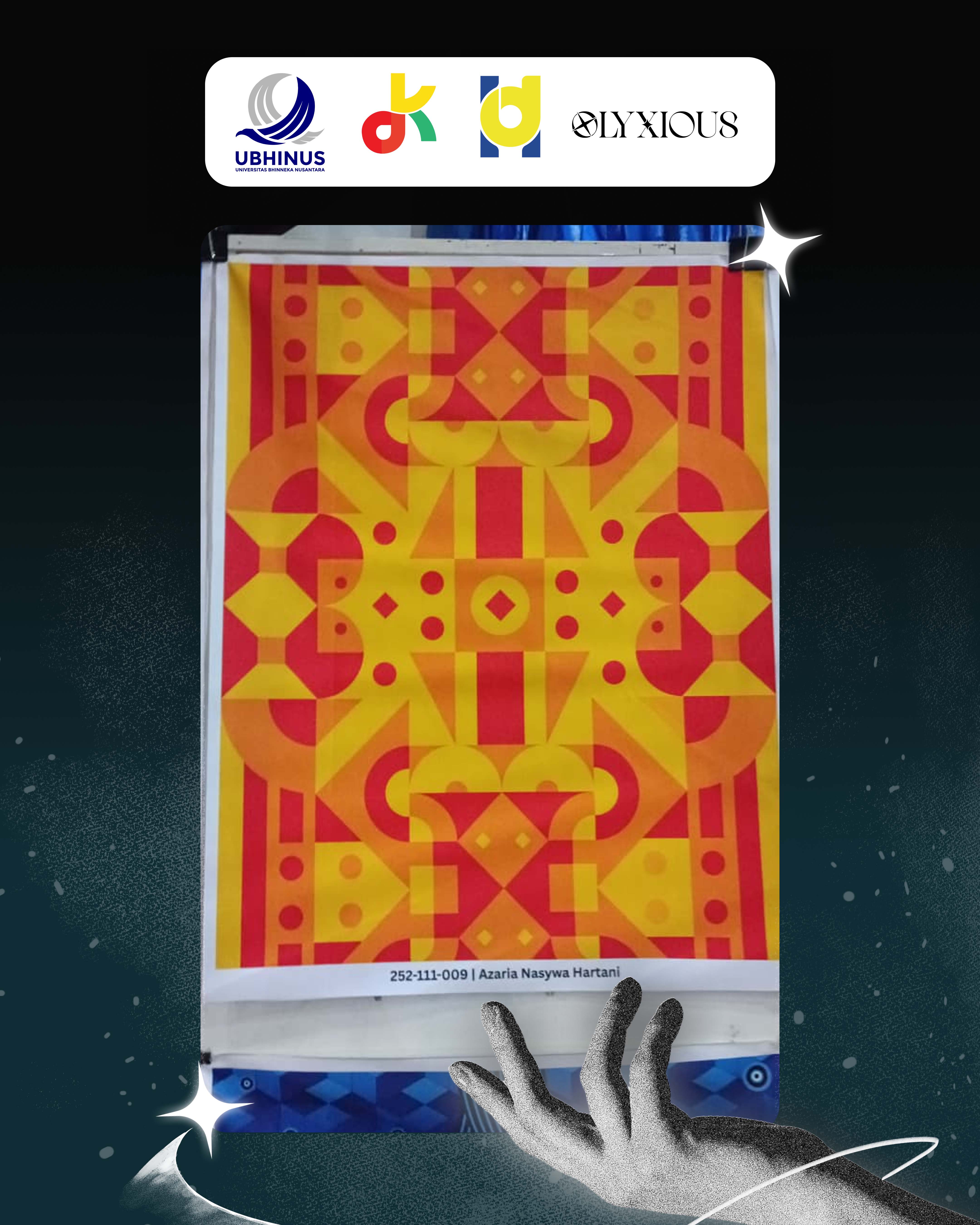 Membuat nirmana digital dengan media cetak kain dan menggunakan warna panas.