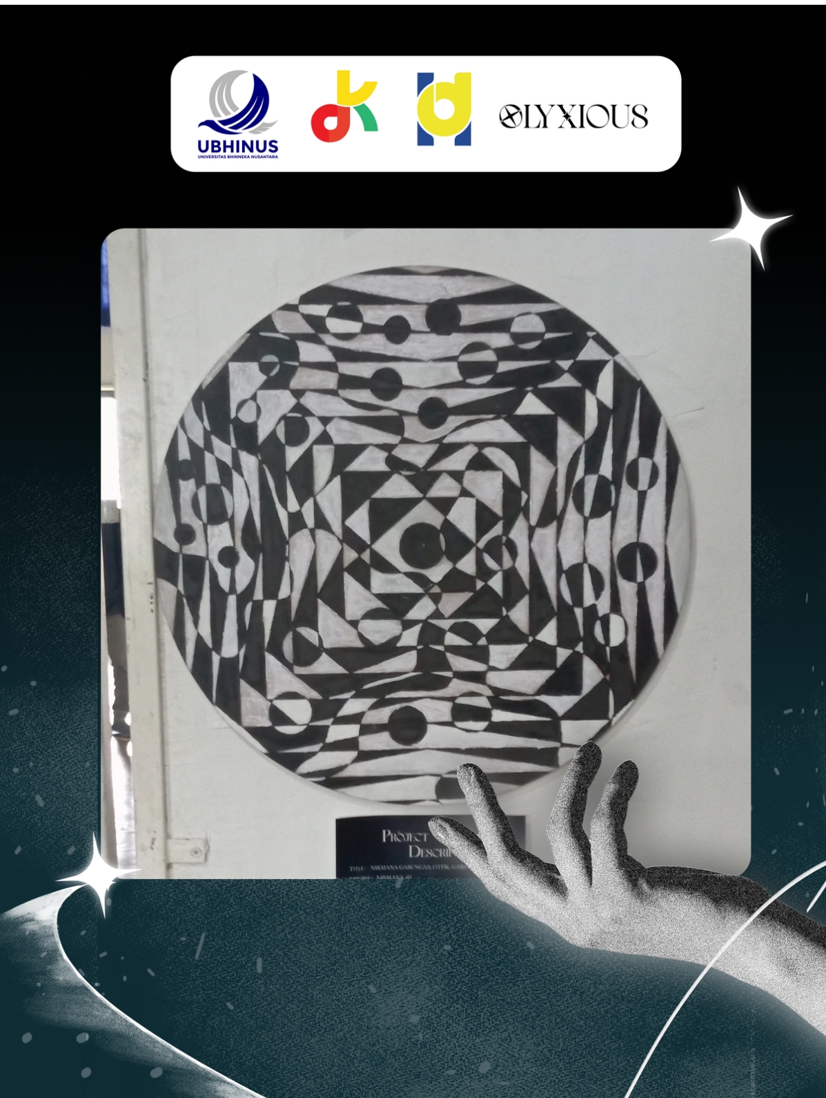 Karya nirmana hitam putih berbentuk lingkaran dengan pola geometris repetitif. Kontras kuat dan ilusi optik menjadi fokus utama visual.