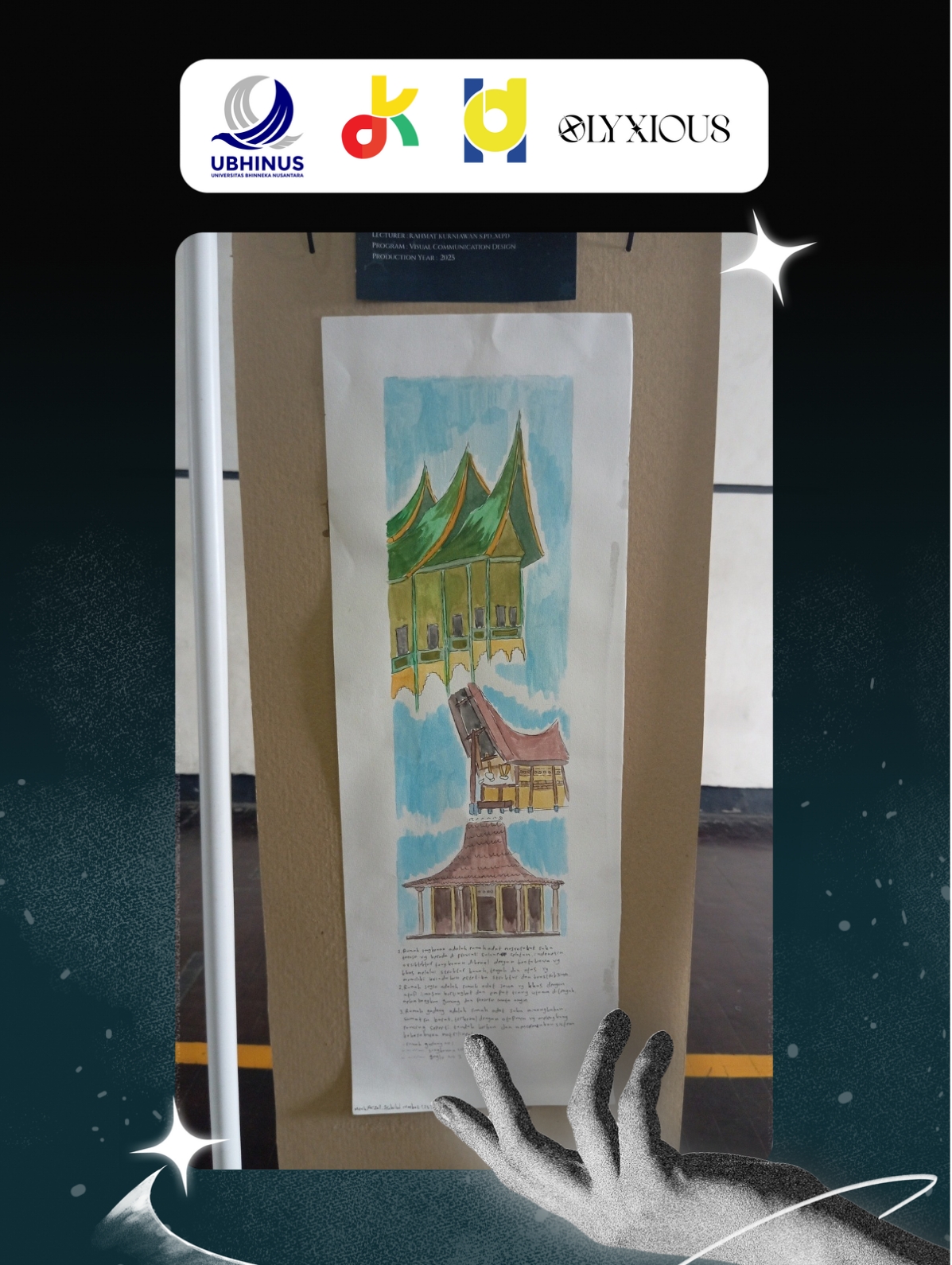 Ilustrasi rumah adat Nusantara yang disusun vertikal. Menggambarkan kekayaan arsitektur tradisional dengan warna lembut dan gaya manual.