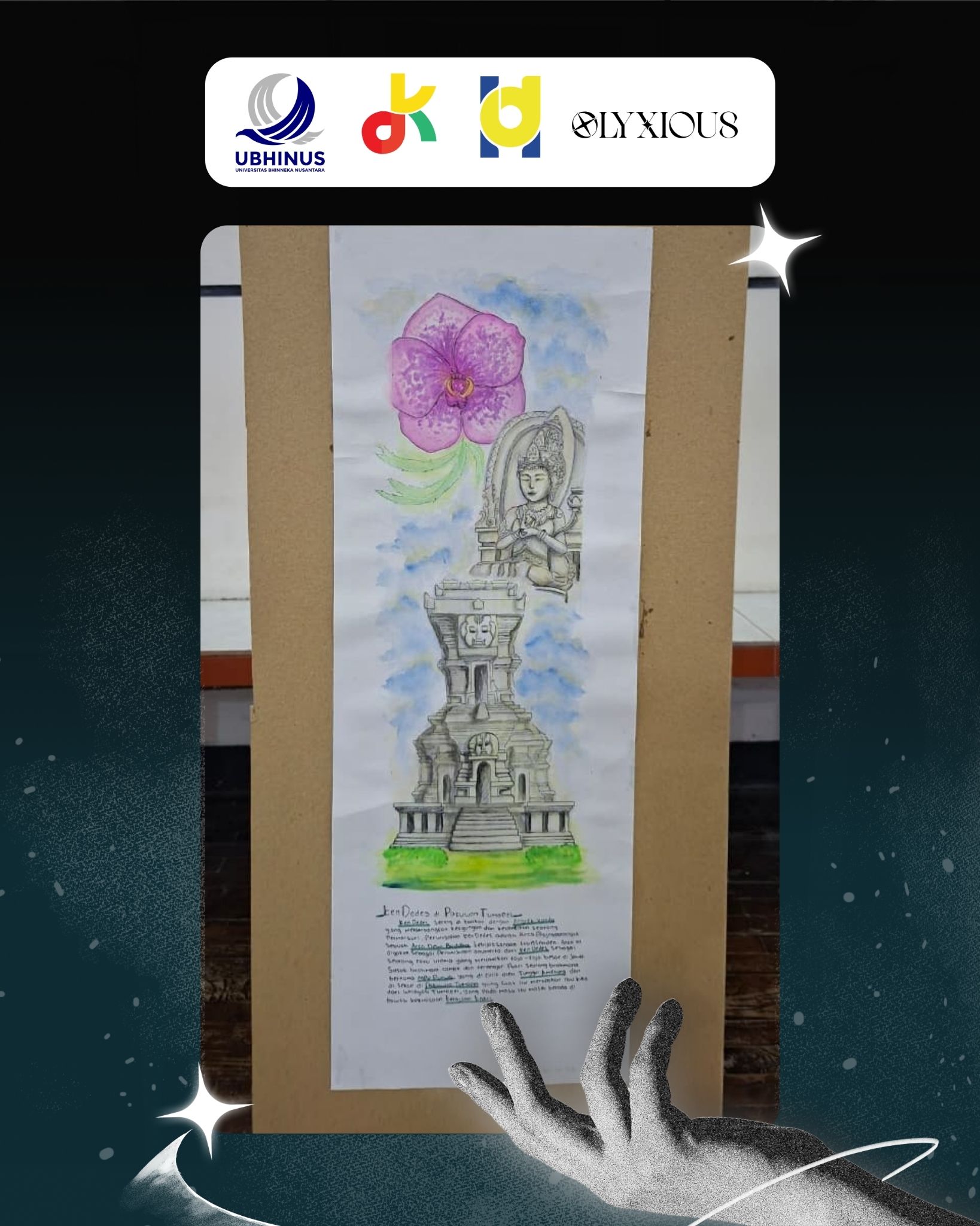 Gambar arsitektur tradisional berupa pakuwon tumapel sebelum berubah nama menjadi kerajaan Singasari dan arca perwujudan Ken Dedes yaitu prajnaparamita dengan bunga angrek vanda yang sering di sebut vanda ken dedes