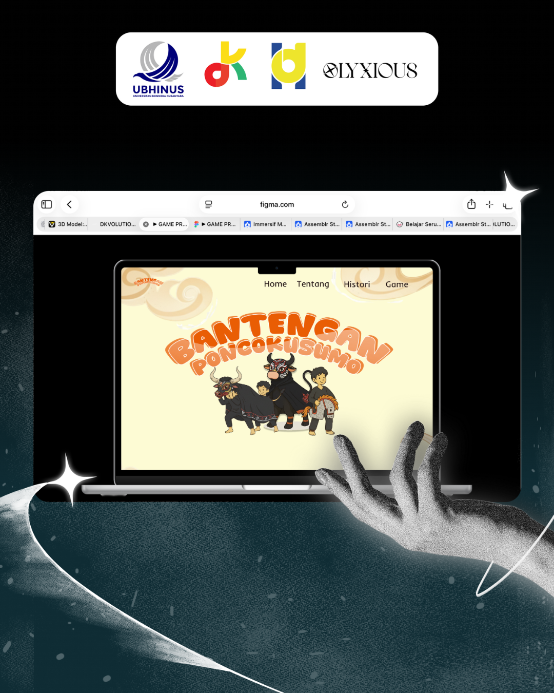a laptop screen mockup showing the homepage of the "Bantengan Poncokusumo" website. The web interface design is clean and bright, featuring a navigation menu (Home, About, History, Game) and the main illustration of the bull and child characters.
