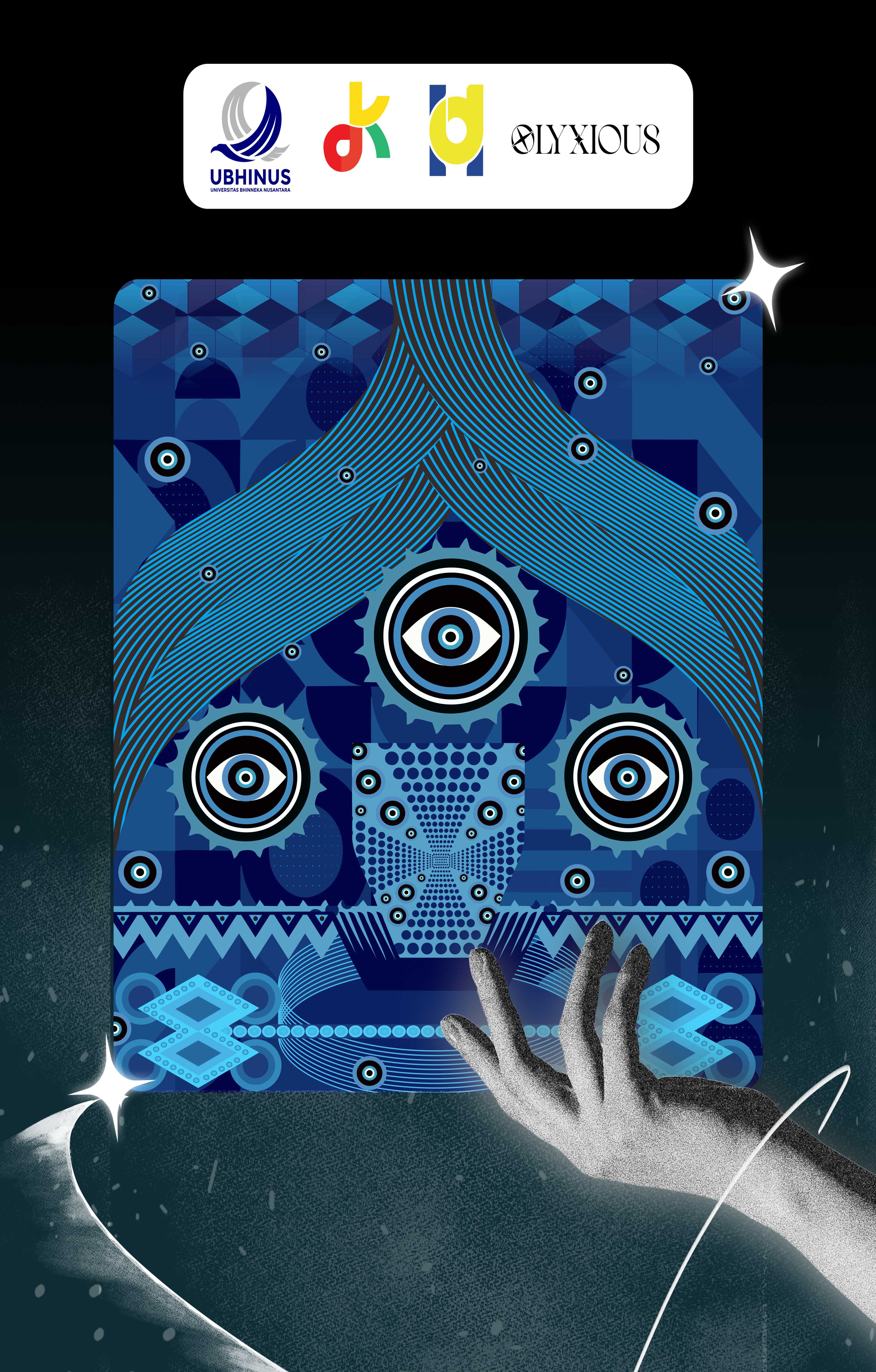 Karya nirmana dwimatra ini merupakan sebuah komposisi visual yang mengeksplorasi hubungan antara identitas manusia dan kompleksitas dunia digital. Menggunakan skema warna monokromatik biru, karya ini menciptakan suasana yang futuristik, tenang, namun penuh misteri. Penguasaan value warna dari biru muda hingga gelap memberikan kedalaman dimensi yang luar biasa, sehingga latar belakang tidak hanya menjadi penghias, melainkan representasi labirin data yang terstruktur secara matematis.