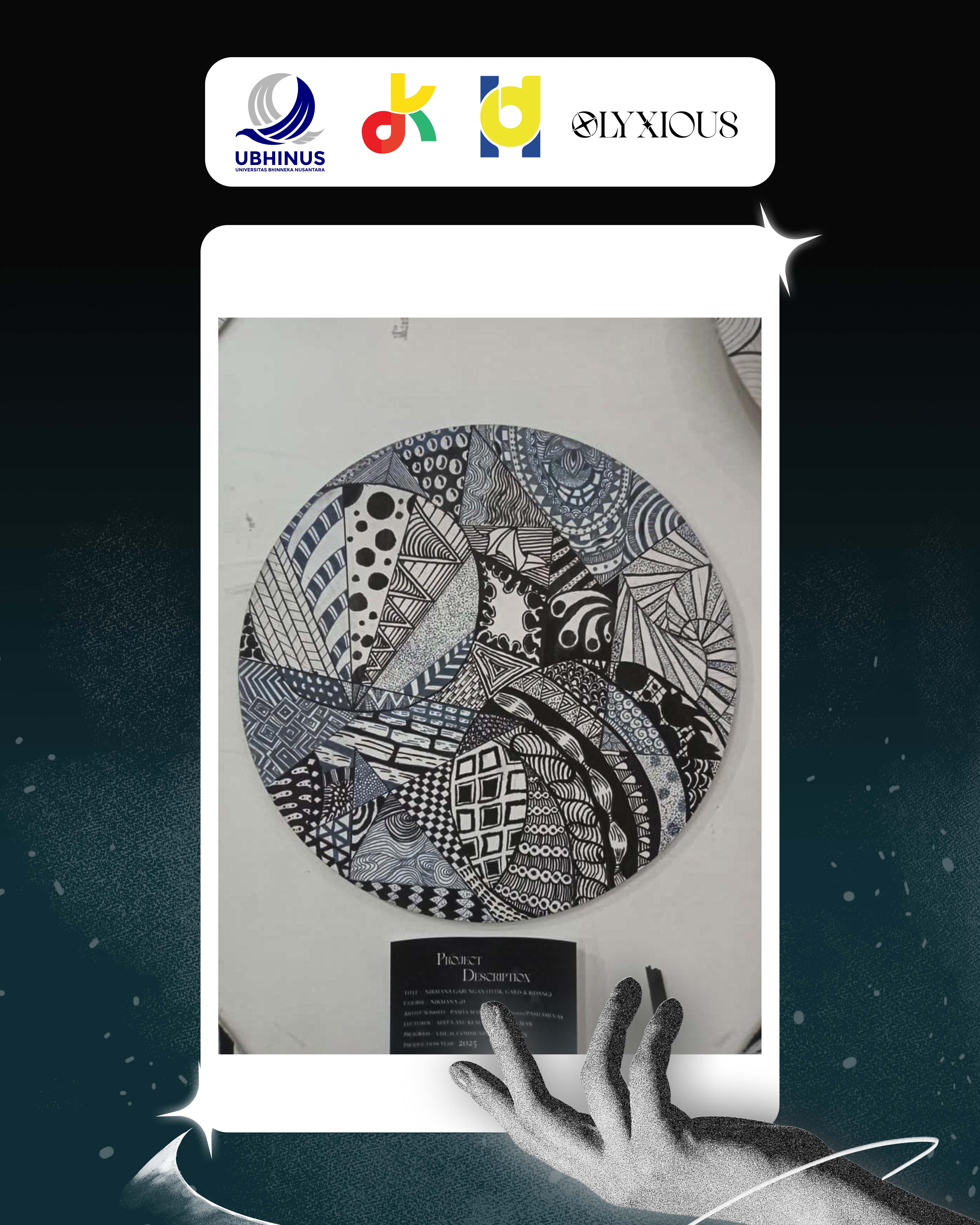 Karya nirmana di atas media MDF (Medium Density Fiberboard) berbentuk lingkaran ini merupakan komposisi Nirmana Gabungan (Titik, Garis, dan Bidang) yang mengeksplorasi elemen visual secara dinamis dan harmonis. Pembagian area dilakukan melalui teknik overlapping dan fragmentasi geometris, di mana setiap bagian diisi dengan berbagai variasi tekstur semu seperti pola dots, garis-garis sejajar, hingga bidang catur yang menciptakan kontras hitam-putih yang kuat. Penggunaan prinsip irama dan dominansi sangat terasa pada transisi antar pola yang berbeda, memberikan kesan kedalaman serta dimensi visual yang kaya meskipun hanya menggunakan palet monokromatik.