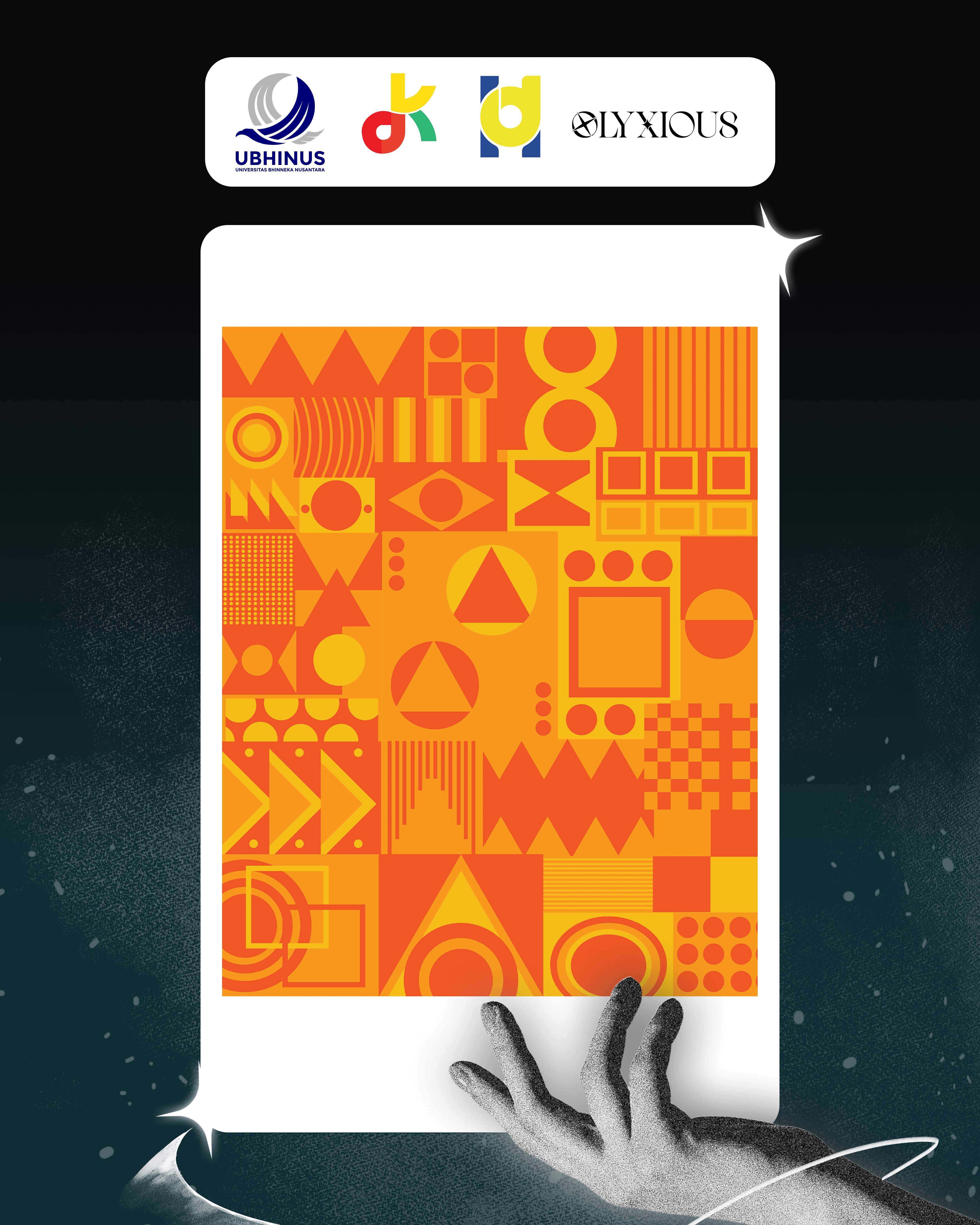 Karya nirmana 2D digital ini menampilkan komposisi grid yang kompleks dengan menggunakan skema warna analogus yang hangat, terdiri dari gradasi oranye, kuning. Menggunakan Nirmana Gabungan (Titik, Garis, dan Bidang)