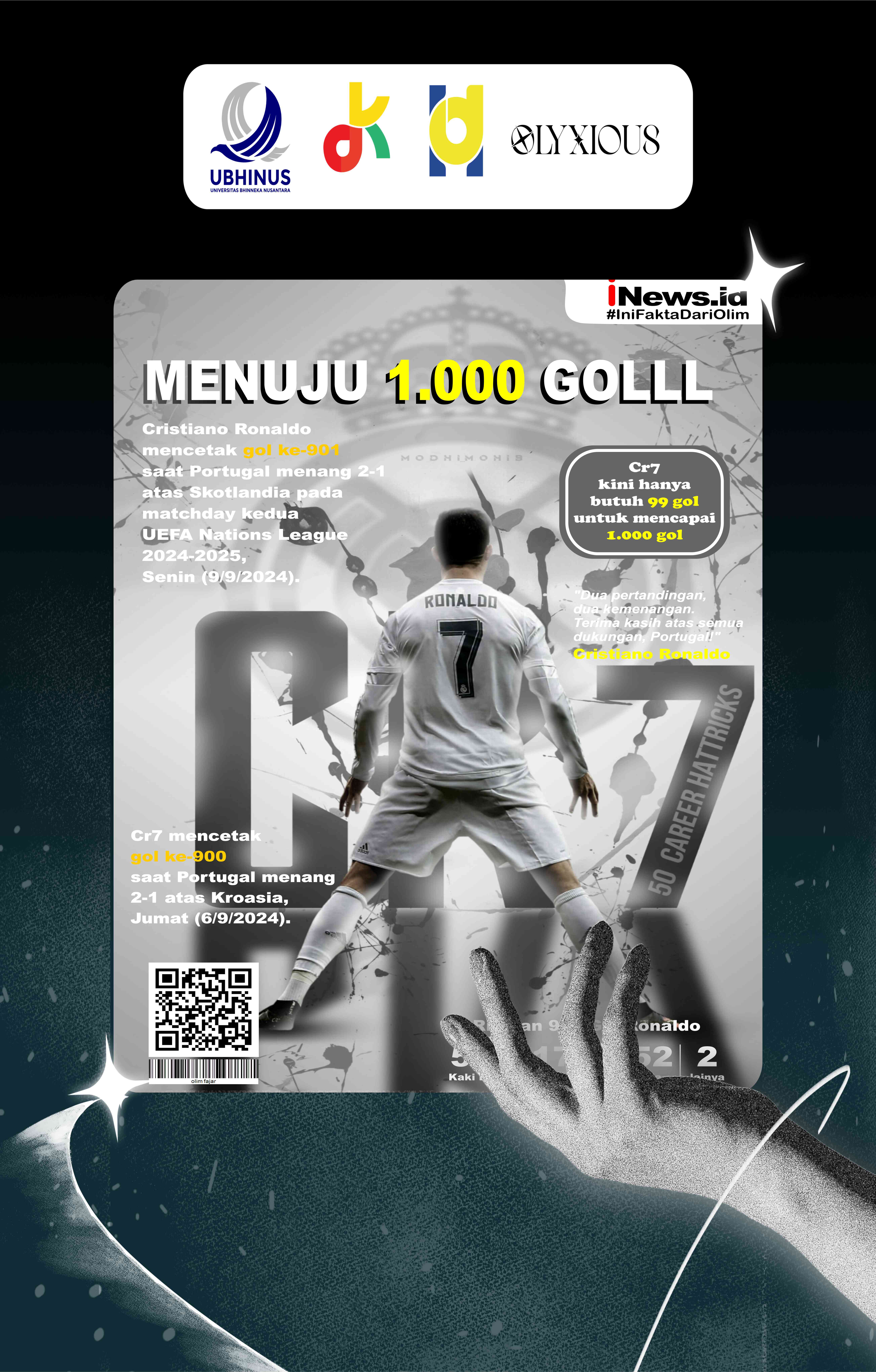 Karya ini merupakan sebuah desain publikasi berupa sampul majalah infografis yang mengangkat pencapaian prestasi pesepak bola Cristiano Ronaldo. Desain ini menggabungkan elemen fotografi, tipografi yang kuat, dan data statistik menjadi satu kesatuan visual yang informatif dan modern.